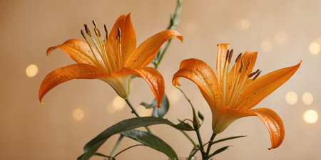 Close-up of two vibrant orange lilies in full bloom, showcasing intricate details of the petals and stamens against a neutral background.