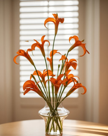 AI Generated. Vibrant orange flowers in vase captured in warm sunlit room with white blinds