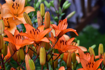 Close-up of vibrant orange lily flower blooming in a green garden. Petals and stamens sharply in focus with natural light and shallow depth of field.