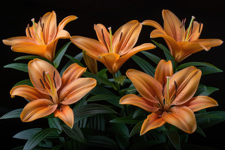 Close-up of Four Orange Lilies with Green Leaves Against a Black Background