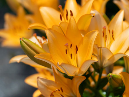 Vibrant Yellow-Orange Lily Blooms in Summer Garden - Close-Up Stock Photo