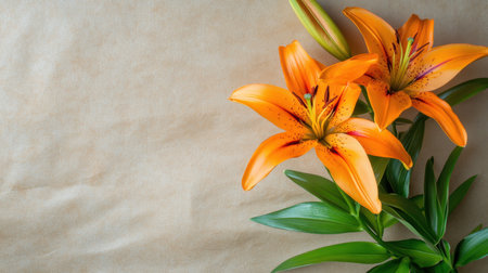 Three Vibrant Orange Tiger Lilies Elegantly Arranged on a Textured Background With Copy Space