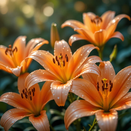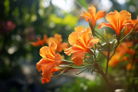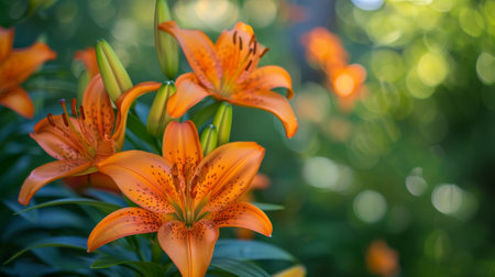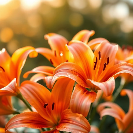 In a vibrant garden during spring, delicate orange lilies showcase their beauty amidst a soft, blurred background of green and golden hues, illuminated by warm sunlight..