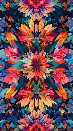 This visually striking digital showcases a captivating kaleidoscopic array of radiant abstract floral motifs Layers of vibrant psychedelic colors and patterns overlap and intertwine creating a
