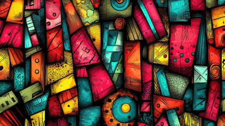 This vibrant abstract artwork showcases a dynamic arrangement of colorful geometric shapes and intricate textures. Perfect for modern design.
