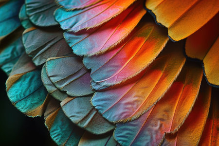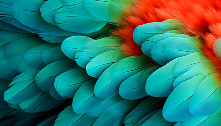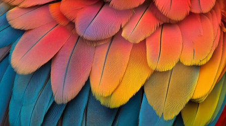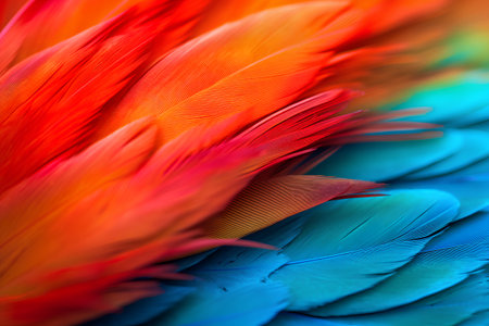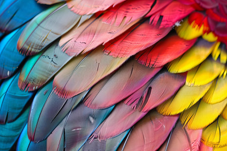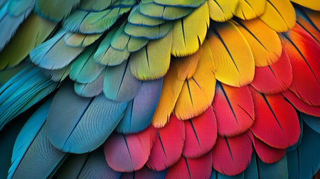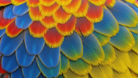 Vibrant closeup of multicolored parrot feathers showcasing intricate textures