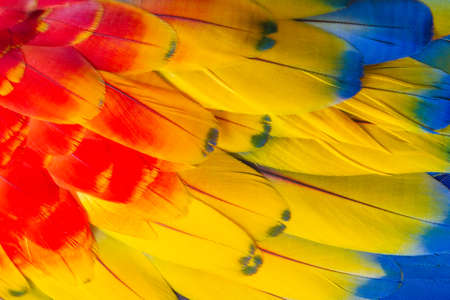 Colorful bird feathers background, closeup of beautiful colorful bird feathers