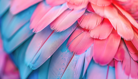 Colorful feathers display a striking array of pink, blue, and orange hues, showcasing the beauty and intricacy of nature. Each feather adds to the captivating texture and visual harmony.