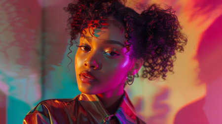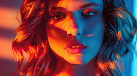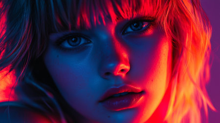 A close-up portrait of a young woman in dramatic, colorful lighting, highlighting her facial features and symbolizing individuality and modern style.