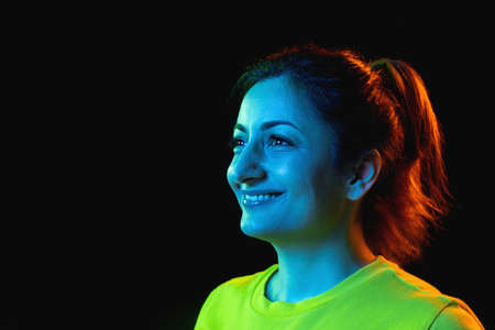 Caucasian young womans portrait on dark studio background in neon. Concept of human emotions, facial expression.