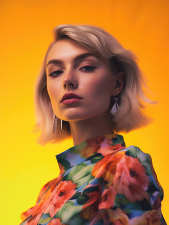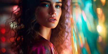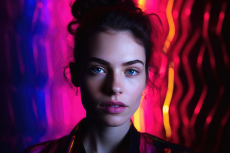 Woman fashion portrait on abstract colorful background. Female model looking at camera, neon colored lighting. Created with Generative AI