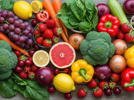 A colorful array of fresh fruits and vegetables, including broccoli, strawberries, lemons, and bell peppers, beautifully arranged on a rustic wooden table, perfect for a healthy lifestyle and diet.