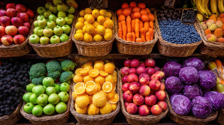 Discover a vibrant array of fresh fruits and vegetables arranged in a stunning rainbow display. This colorful collection showcases a variety of textures and hues, celebrating healthy eating.