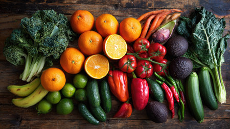 An overhead shot features a colorful array of fruits and vegetables. Vivid oranges, red peppers, tomatoes, and various green produce create a visually appealing composition. The textures vary from smooth citrus to rough vegetables, with natural light enhancing the colors. This image suits various uses including health, nutrition, and dietary content.