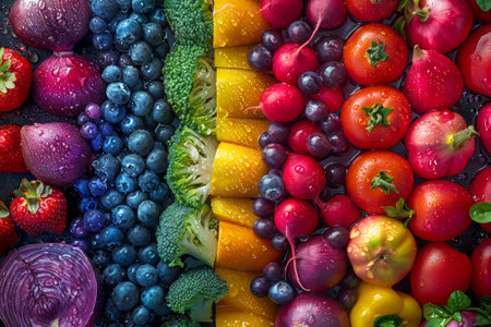 rainbow gradient made of various fruits and vegetables, created with generative ai