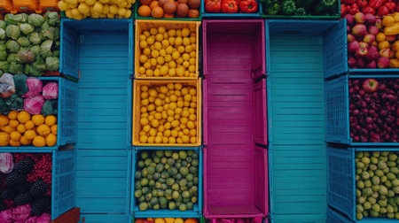 A vibrant overhead view of a fresh produce market featuring colorful crates of fruits and vegetables. This image captures the essence of healthy eating and local agriculture with its rich textures and colors.