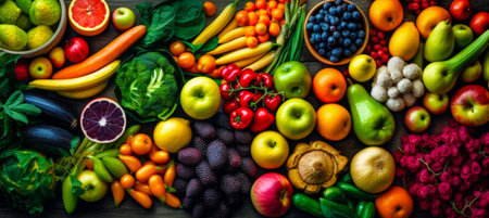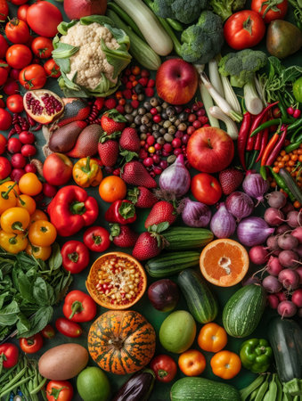 A colorful display of assorted fruits and vegetables, showcasing the bounty of a healthy and balanced diet.