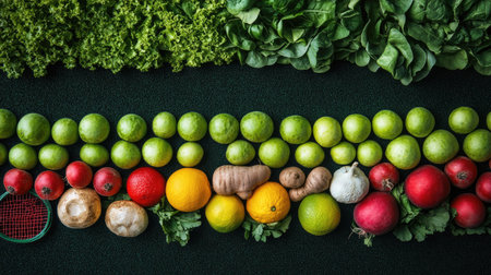 A vibrant collection of assorted fruits and vegetables arranged artistically. Perfect for showcasing fresh produce, healthy eating, and culinary inspiration.