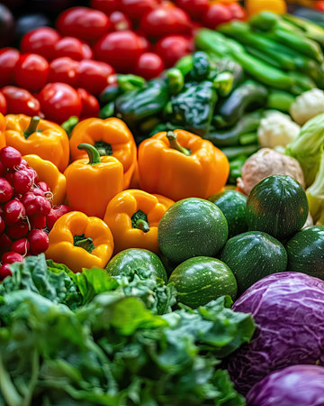 A colorful assortment of fresh organic vegetables fills the market stall, showcasing a variety of textures and hues. Bright yellow bell peppers, deep green zucchinis, vibrant red tomatoes, and leafy greens create a visual feast of nature's bounty. The natural light enhances the freshness and promotes healthy eating choices.