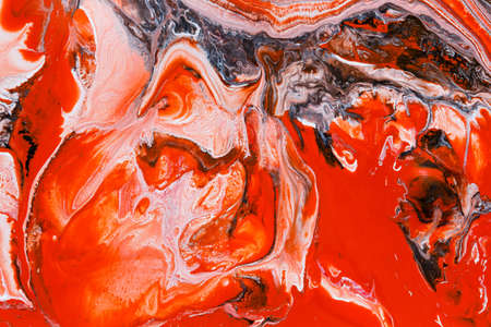 Acrylic color drip. Paint fluid mix. Defocused red black pigment powder grain particles water dye ink emulsion liquid flow abstract art background.