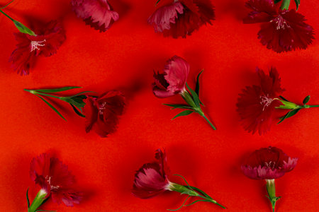 A bouquet of red flowers with a red background. The flowers are arranged in a way that they are all facing the same direction. Scene is warm and inviting, as the red flowers are a symbol of love
