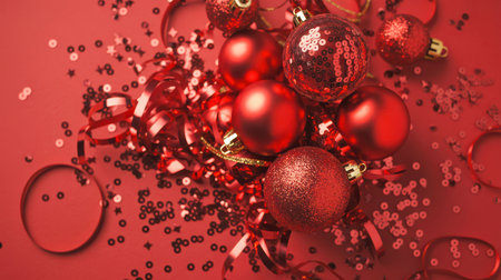 A top down view of a cluster of red Christmas ornaments and scattered red confetti and ribbons on a solid red background.