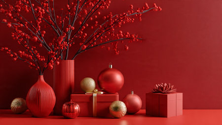 Red holiday flat-lay accented with subtle golden ornaments and minimalist gifts.