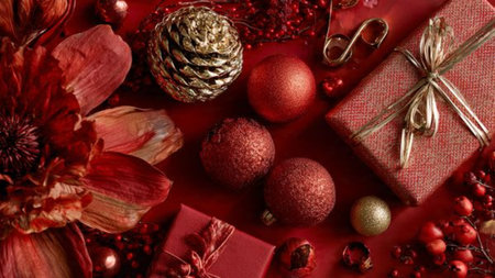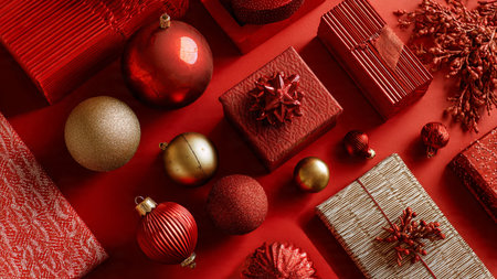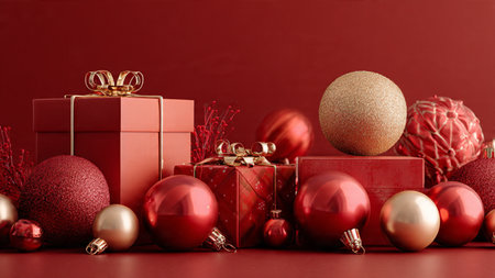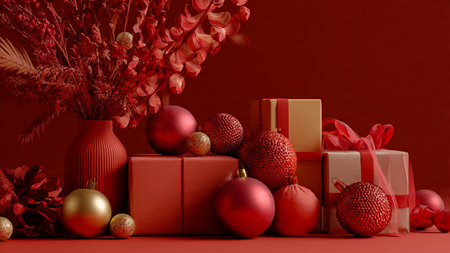 A vibrant red holiday scene featuring an array of gift boxes and festive ornaments, set against a striking red background.