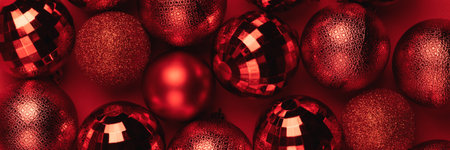 Christmas banner with red glitter bauble balls on red background with copy space. Wide panoramic header