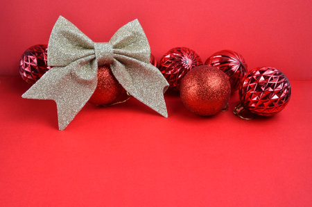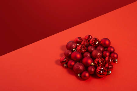 Red Christmas baubles decoration on paper red background with copy space for New Year and Merry Christmas
