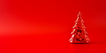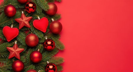 A festive display of lush green Christmas tree branches adorned with an assortment of shiny red baubles, stars, and heart-shaped ornaments, set against a bright red backdrop, creating a joyful holiday atmosphere with ample copy space.