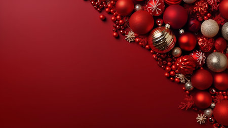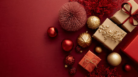 A vibrant red background decorated with Christmas ornaments, presents, and pine branches. Perfect for capturing the festive spirit of the holiday season.