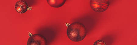 Banner. Red baubles of Christmas decoration on a red background. Christmas balls. Minimalistic style. Flat lay.