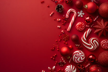Christmas red background or border with christmas ornaments and candies, with copy space. High quality photo