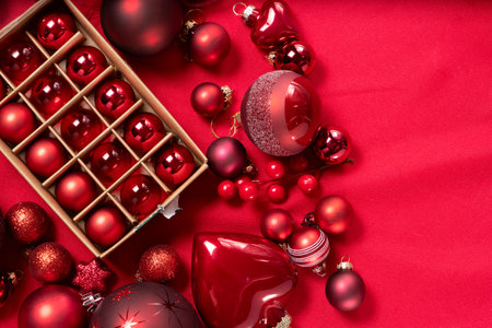 A collection of red Christmas ornaments, some still in their box, are scattered across a vibrant red surface, creating a festive holiday scene.