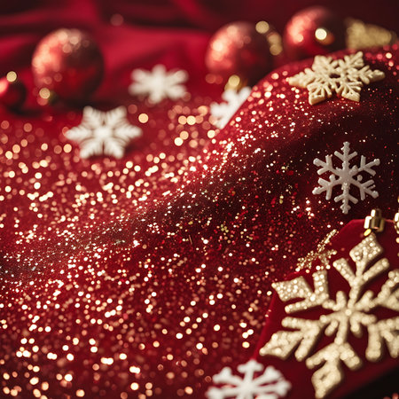 A close-up of red glitter fabric adorned with white snowflakes and red Christmas ornaments, creating a festive sparkle.