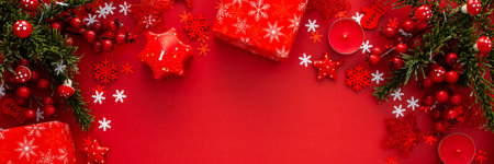 Red Christmas background with fir branches and red Christmas tree toys and balls and candles, banner