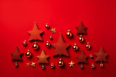 Festive red and gold Cristmas tree decorations on red background. Flat lay style. Place for text.