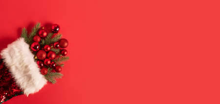 Banner. Red baubles of Christmas decoration on a red background. Christmas balls and fluffy circles. Minimalistic style. Flat lay.