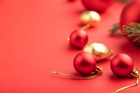 Christmas or New Year composition. Decorations, red balls, fir and spruce branches, on a red paper background. Side view, copy space, selective focus.
