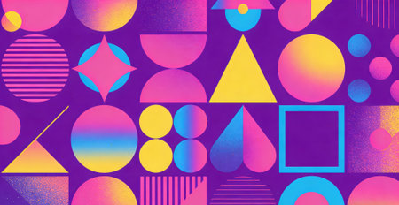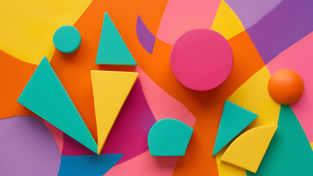 This vibrant image features a striking arrangement of geometric shapes in various colors on a bold split background, perfect for artistic themes and modern design projects.