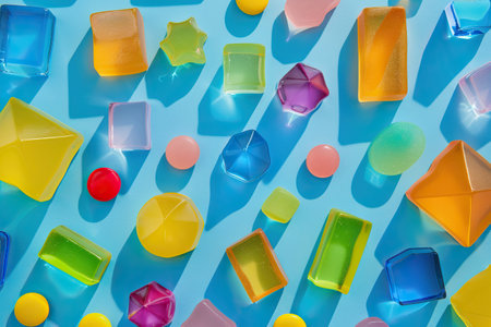 An artistic arrangement of colorful dessert shapes and sweets on pastel blue and pink surfaces, highlighting geometric designs and vibrant textures.