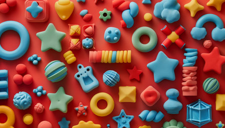 A lively assortment of colorful clay shapes lies on a bright background, inspiring imaginative play and artistic creation in a cheerful atmosphere.