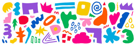 Abstract set of colorful hand drawn various shapes, curls, forms and doodle objects. Trendy vector illustration
