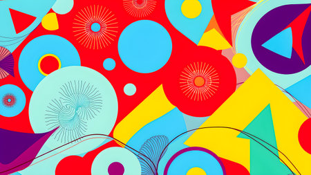 Vibrant abstract composition featuring various geometric shapes in a colorful arrangement, creating a visually engaging design.