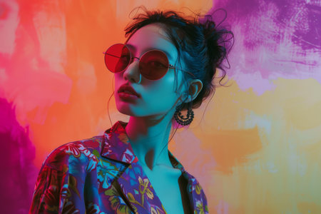 Young caucasian woman in colorful sweater and sunglasses against vibrant abstract background.