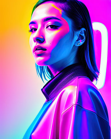 Young female model posing with trendy fashion outfit and colorful glowing vibrant green lime and pink optical art abstract background. Picturesque generative AI