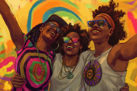 Three friends are celebrating Juneteenth, embracing and taking a selfie together with a colorful background