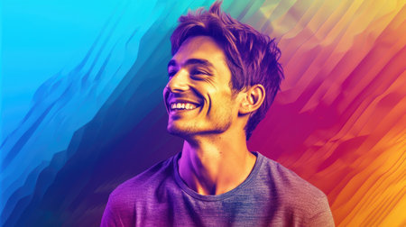 Portrait of a handsome young man laughing and looking at camera while standing against colourful background