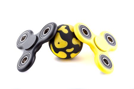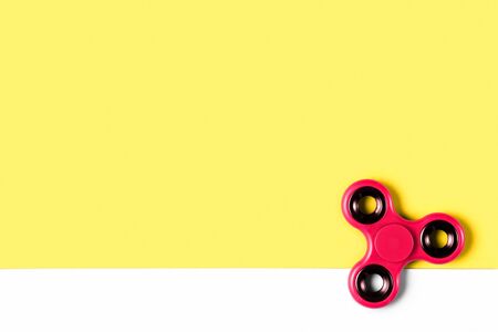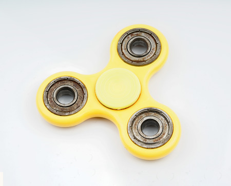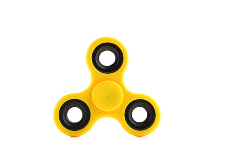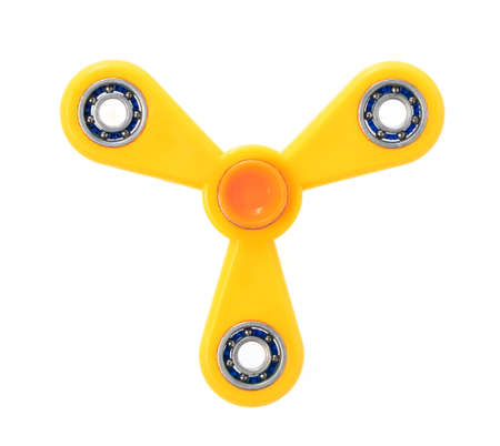Fidget finger spinner, anxiety relief toy on white isolated background, copyspace. Concept relieving stress